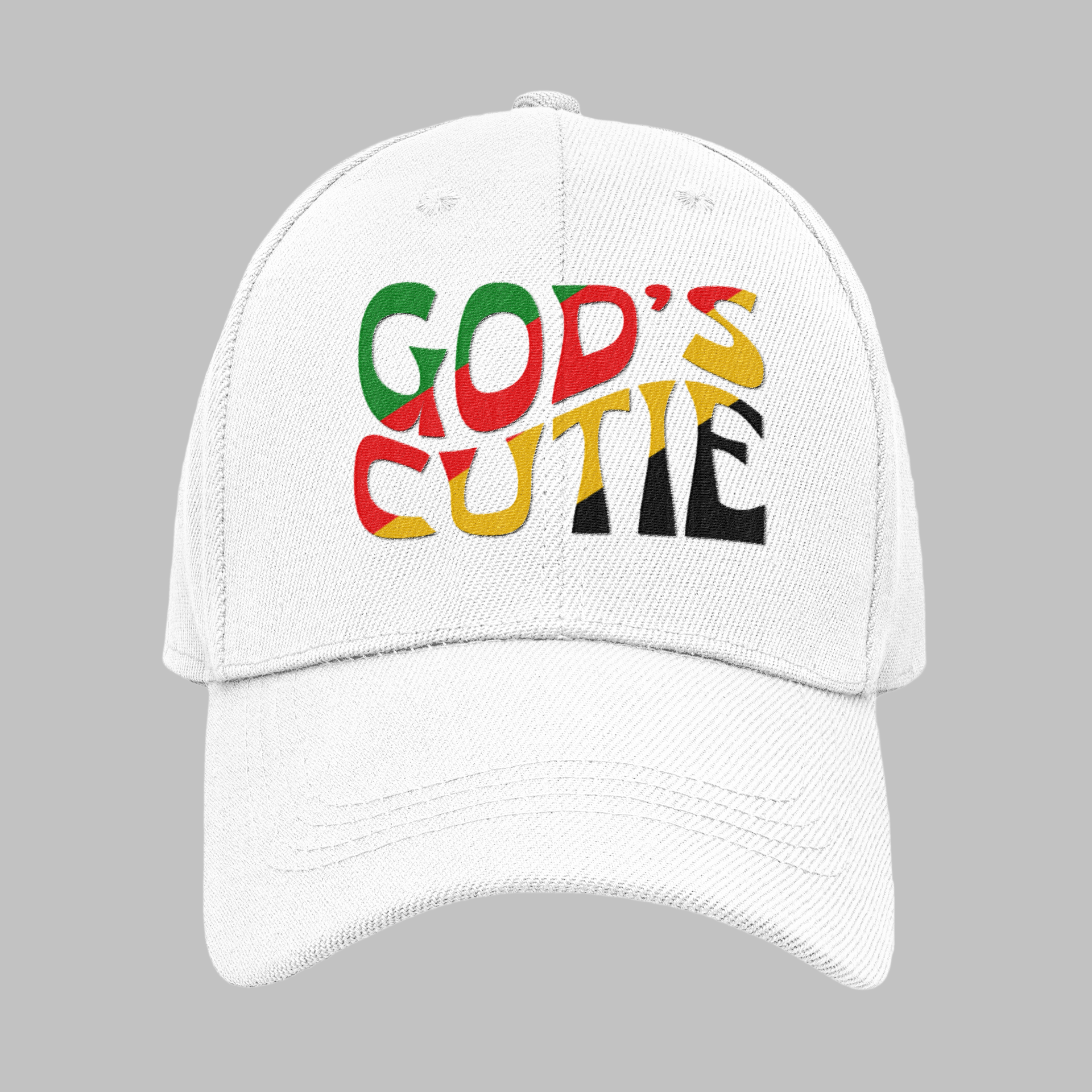The God's Cutie Distress Hat. Made with 100% pre-shrunk cotton twill, this Dad Hat features a soft crown and an adjustable hook-and-loop closure for a comfortable fit. The distressed fabric on the brim and crown adds a trendy touch to any outfit.